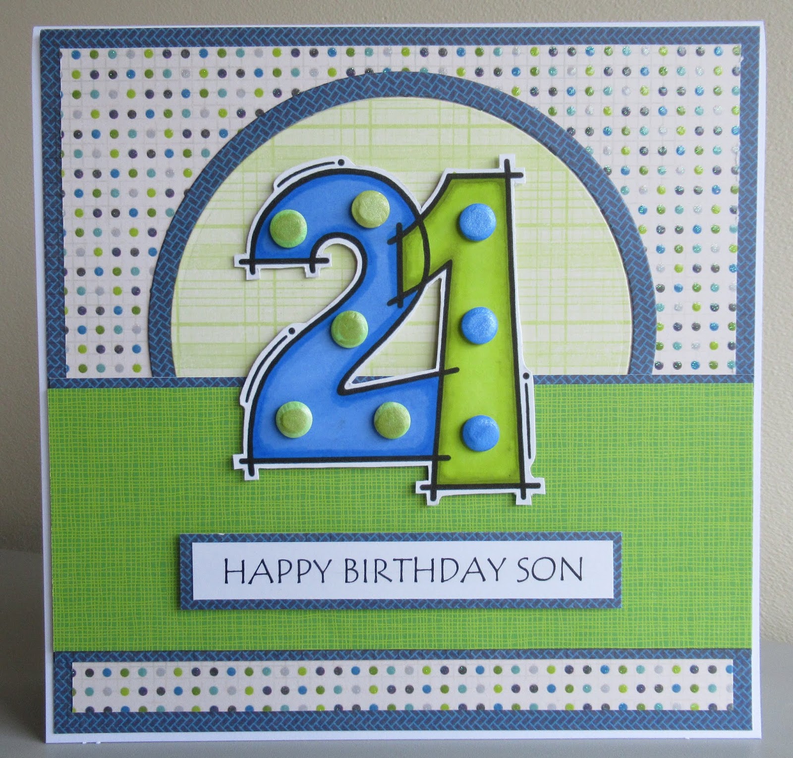 I have had this old Woodware '21st' stamp for about 5 years - I've coloured with vivid blue and lime green pro-markers, then carefully fussy cut. The patterned backing papers are from a DCWV pad and I've added a greeting created on the computer in Publisher.
